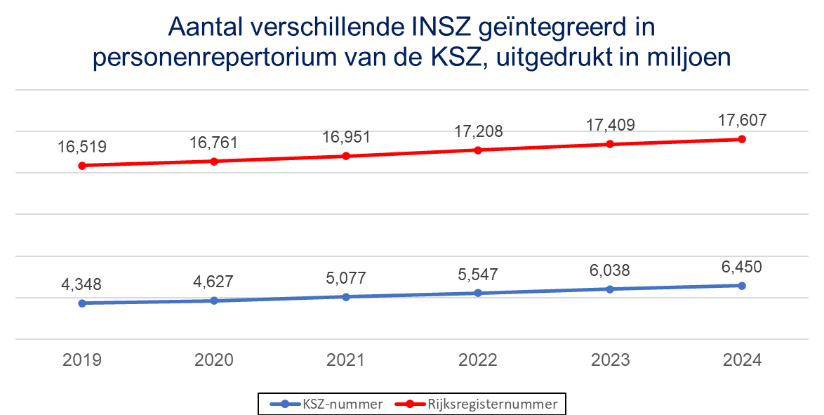 Het aantal geïntegreerde INSZ binnen de Kruispuntbank is groter dan het aantal fysieke personen die in België verblijven. Dit wordt verklaard door 2 factoren: enerzijds is het toepassingsgebied van de sociale zekerheid veel groter dan de reglementering met betrekking tot de bevolkingsregisters (bv. grensarbeiders en migrerende werknemers); anderzijds worden de INSZ van de overledenen nog een zekere tijd behouden omdat ze de rechten blijven bepalen van de overlevende rechthebbenden.
